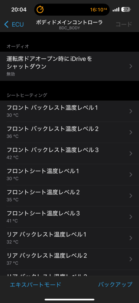 センサー位置の影響なのか、久々のシートヒータの感覚なのかわかりませんが、少し熱めに感じたので、Bimmer Codeを使って狙い温度を設定可能範囲の最低まで下げておきました。