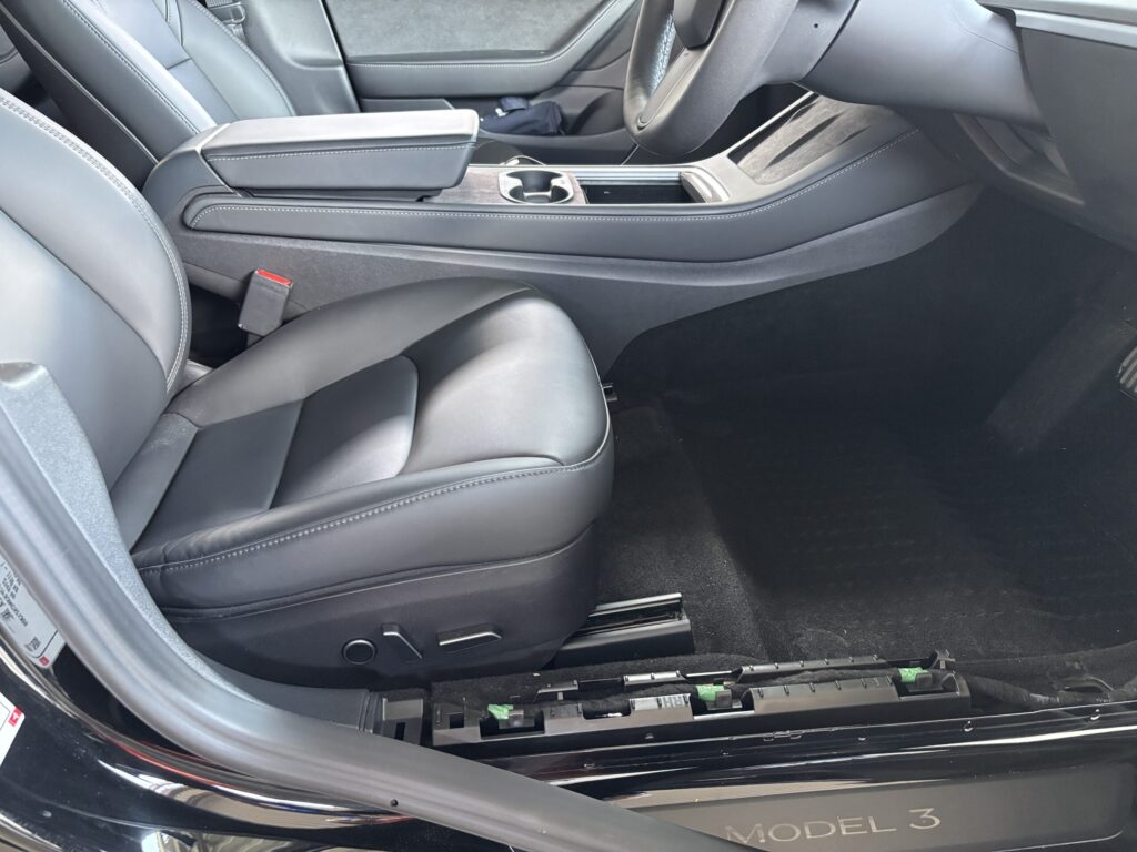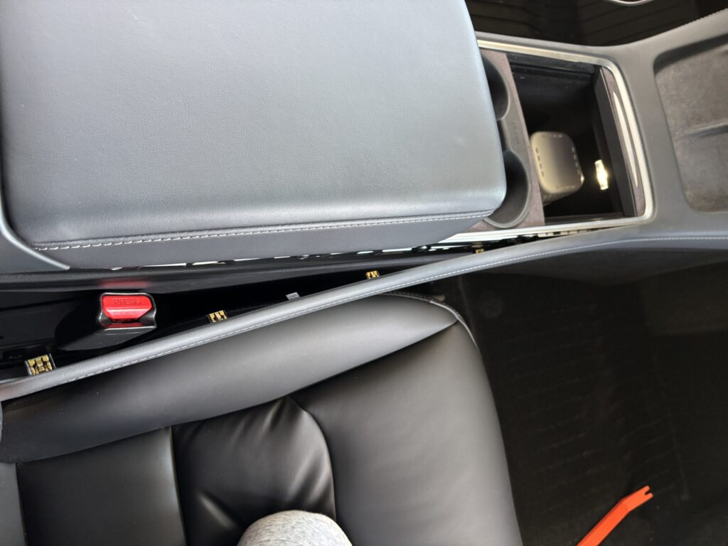 モデル3の内装はスッキリしていますが、実はパネルが重なり合っています。サイドのパネルをパコッと外すのですが、ここが一番緊張するポイント。爪の位置を意識しながら、手前に引くイメージで剥がします。結構硬いです。
