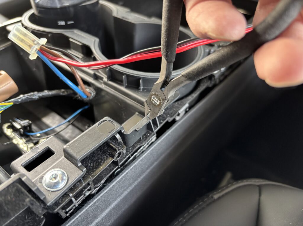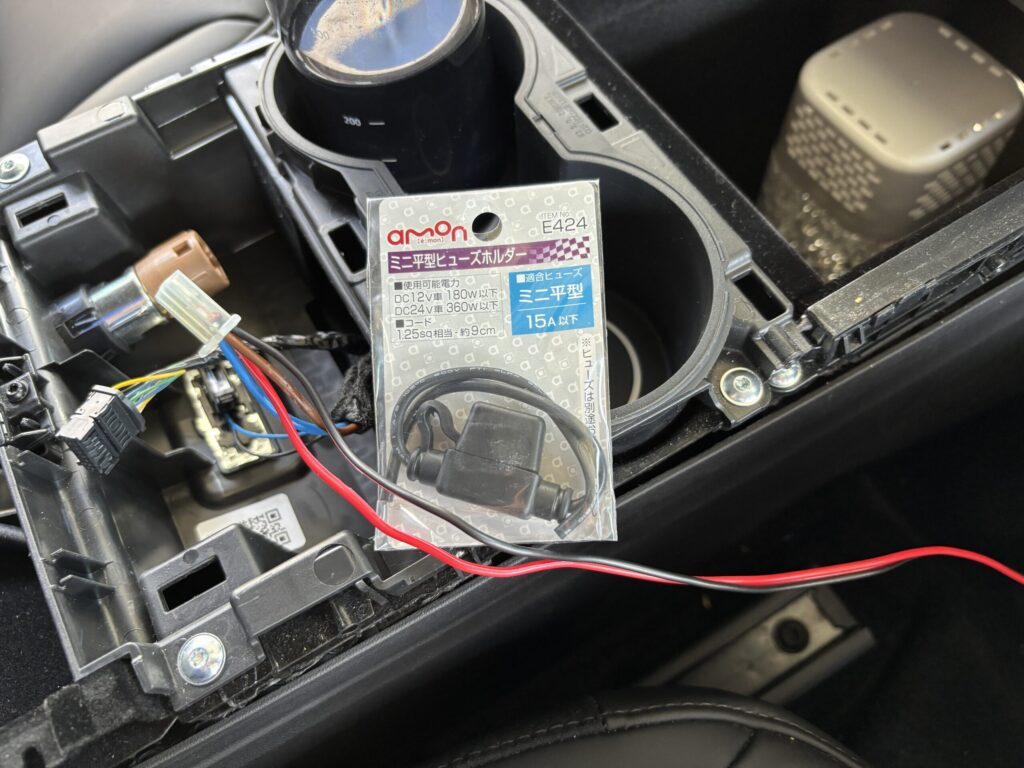 「え、シガーソケットに挿しっぱなしにするの?」と思うかもしれませんが、そうではありません。コンソールの裏側で、シガーソケットに来ている電源配線に割り込ませる形をとります。
