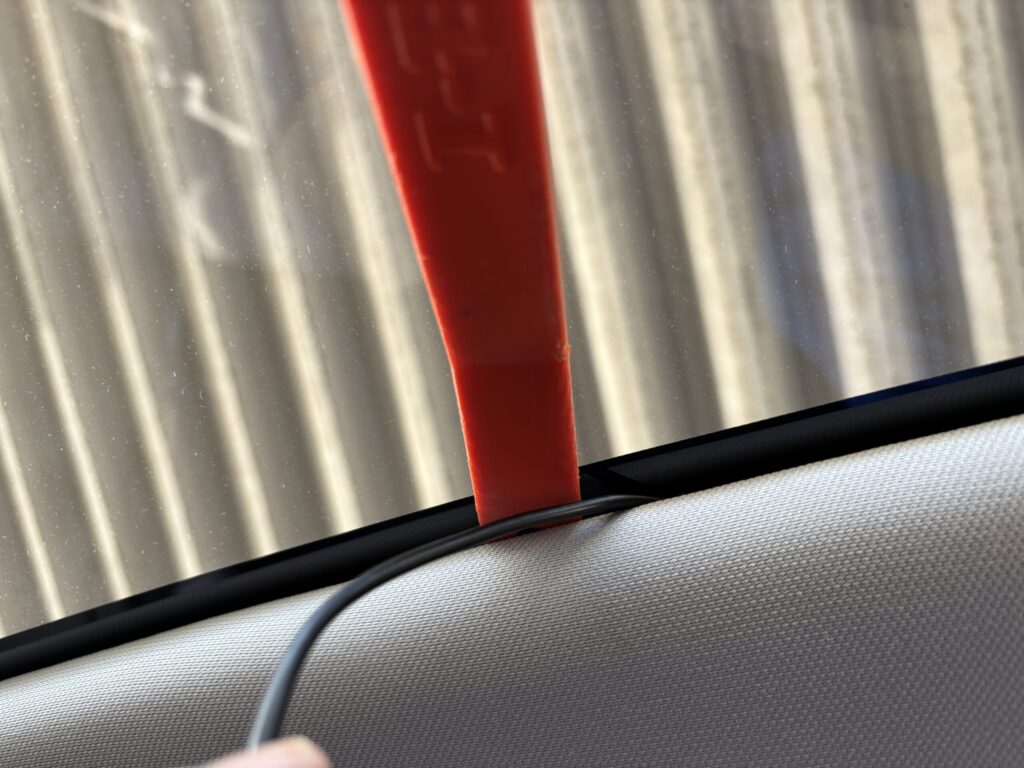 ダッシュボードの上に置くだけだとテスラ特有のミニマムなデザインが崩れてしまいますが、ピラーの角に寄せることで、まるで純正オプション?のような収まりの良さになります(と思い込みます)。配線も、先ほど外したウェザーストリップや、Aピラーの隙間を通せば、外からはほぼ見えません。